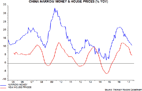 China could be an exception to a general trend towards tighter monetary policies in the first half of 2018. The authorities have already moved to a modestly restrictive stance and annual narrow money growth has fallen significantly since late 2016. Money trends lead house prices, suggesting that the latter will slow further in early 2018 – fourth chart. Monetary policy was eased on the last three occasions that annual house price inflation fell to zero.