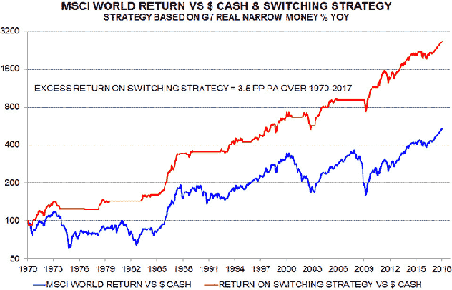 In addition to expecting a less favourable growth / inflation mix in 2018, we judge that monetary conditions are no longer conducive to asset price appreciation. Our historical research found that bouts of equity market weakness were usually preceded by G7 annual real narrow money growth falling below its long-run average of about 3% or declining sharply (i.e. by 3 percentage points within six months). A strategy of switching into cash under such conditions would have significantly outperformed buy-and-hold – fifth chart.
