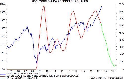Two further reasons for a more defensive stance are slowing QE and the historical correlation of market returns with the stockbuilding cycle. The 12-month running total of purchases of government and agency securities by the G4 central banks peaked in March 2017 and will fall steeply in 2018, based on announced plans – sixth chart. This slowdown could weaken monetary trends, while prior declines in 2010 and 2014 preceded equity market set-backs.