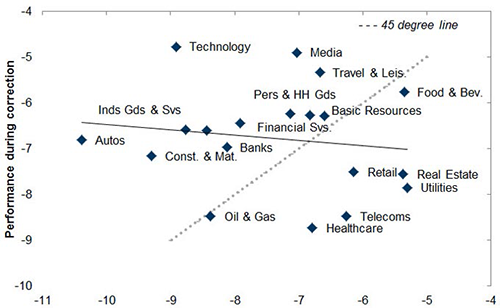 Chart 1: Sector performance in Europe has deviated sharply from the ‘normal’ beta-driven sell-off