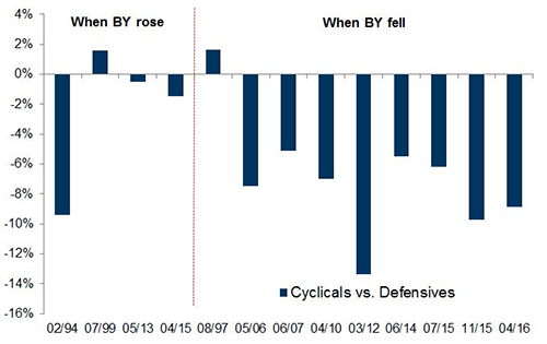 What happens to cyclicals and defensive stocks when bond yields rise or fall?