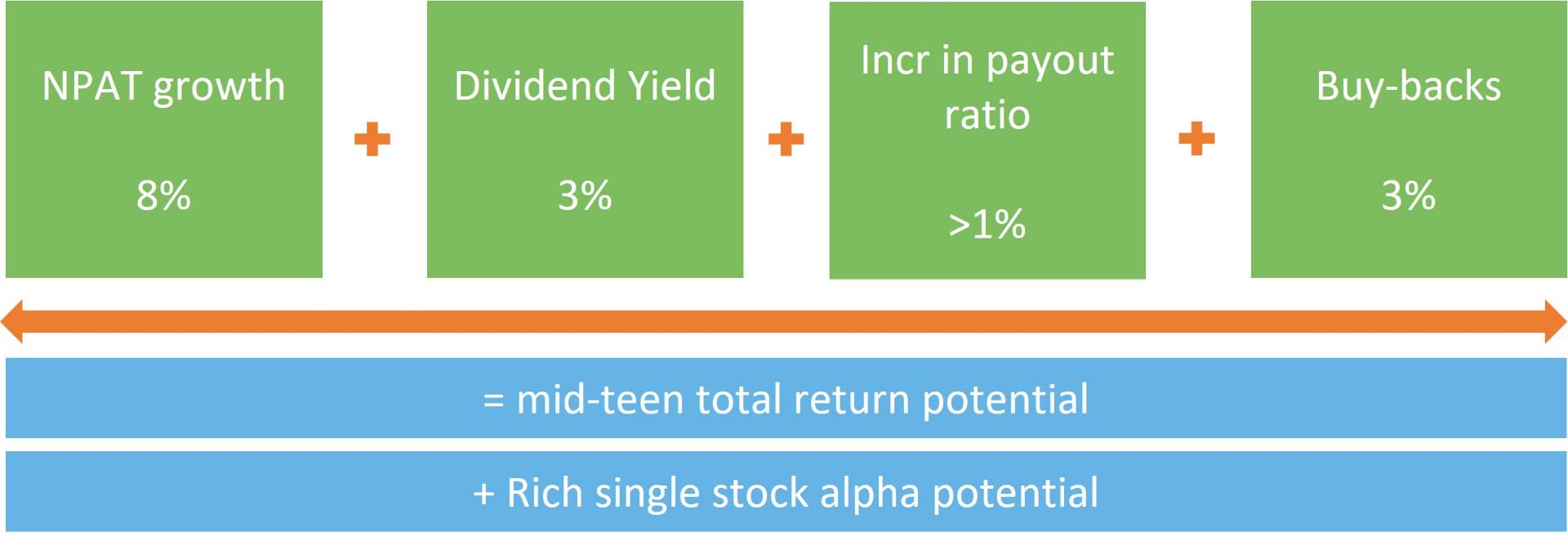 Die Dividendenrendite des japanischen Aktienmarktes ist bekannt. Die starken Bilanzen und klare Trends belegen, dass die Firmen ihre Ausschüttungsquoten erhöhen und Aktien zurückkaufen können. Beim Renditepotenzial japanischer Aktien geht es daher vor allem um eine große Frage: Wie sollen die Unternehmen ihre Gewinne um 8 % steigern? Vielleicht ist dafür kein so großer Vertrauens-vorschuss nötig, wie es auf den ersten Blick scheinen mag.
