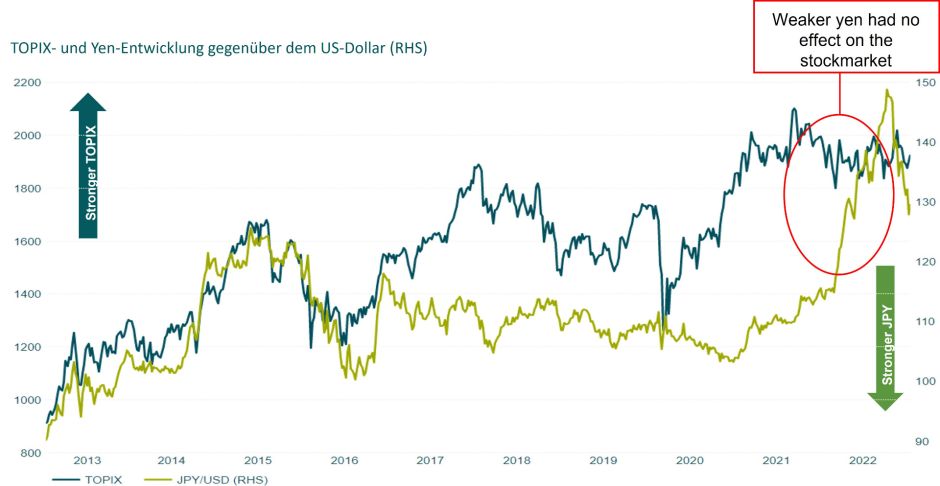 TOPIX- und Yen-Entwicklung gegenüber dem US-Dollar (RHS)