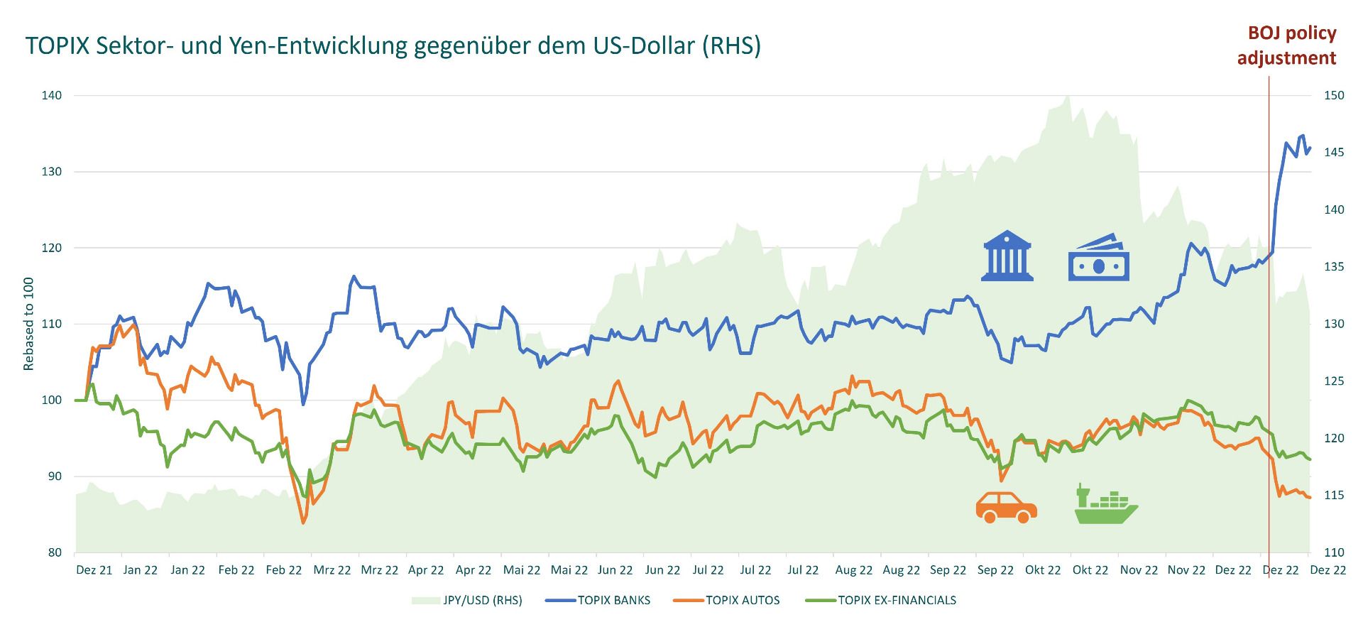 Die exportorientierten Unternehmen konnten ihre Gewinne im Jahr 2022 sehr deutlich steigern (und von einer schwächeren Währung profitierten). Dennoch schnitten sie schlechter ab als der breite Markt. Wir glauben, dass dies auf die Sorgen der Investoren um die Weltwirtschaft zurückzuführen ist. Die Banken dagegen erzielten eine deutlich bessere Wertentwicklung, noch bevor die BOJ ihre Geldpolitik straffte (Abbildung 5).