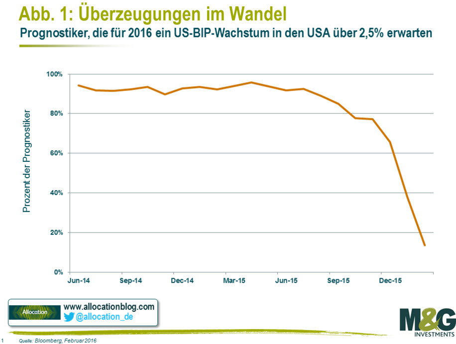 Von Juli 2015 bis Februar 2016 fiel Bloombergs Medianprognose für das US BIP-Wachstum für 2016 um 0,4%. Dies mag sich nicht nach einer dramatischen Umschichtung anhören, doch ist die Verteilung der Prognosen aussagekräftiger. Noch im November erwarteten 77% der Prognostiker ein Wachstum von mehr als 2,5%. Im darauffolgenden Februar waren es nur noch 14%.