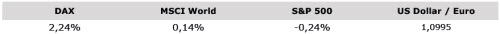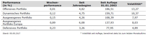 In der vergangenen Handelswoche konnten alle Portfolios zulegen. Dabei wirkte sich rentenseitig die kurze Durationspositionierung neutral aus. Die Beimischungen von Unternehmensanleihen (Hochzinsanleihen und Unternehmensanleihen mit Investment-Grade-Rating) waren gegenüber Euroland-Staatsanleihen leicht im Nachteil und schlossen negativ. Anleihen aus den Schwellenländern und den USA entwickelten sich ebenfalls schwächer als Euroland-Staatsanleihen. Auf der Aktienseite trug die Beimischung der Emerging Markets negativ bei. Auf Sektorebene war die Übergewichtung des IT-Sektors abermals positiv und auch das Übergewicht der Eurozone war wiederholt ein klarer Vorteil.