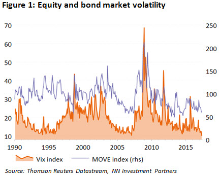 Another boring week in markets. The world is moving and certainly not less complex than it has been in the past. However, it seems that economic, political and behavioural cross-currents below the surface currently create a rare calmness at the surface of global capital markets. As can be seen in Figure 1, volatility in both equity (VIX) and bond markets (MOVE) has fallen back to around record-low levels. Although some might worry that such calmness represents complacency, it has to be noted that counterbalancing forces of different origin and in time-varying strengths can occasionally fall in place to create such a serene environment. In such a situation it is not homogenous ignorance of ever present uncertainty (in other words, many being complacent), but just a fascinating interaction of the different components in the system that cause stability to emerge temporarily.