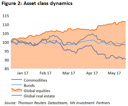 Within equity sectors a large performance differential is visible so far this year. Non-commodity and growth-oriented sectors have done very well. Especially technology (+14% ytd), but also consumer discretionary (+6% ytd) and industrials (+6% ytd) have done substantially better than e.g. financials (flat) and energy (-13% ytd!) which have suffered from flatter yield curves and softer commodity prices.
