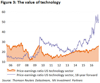 The strong performance of the technology sector has also created a new worry of complacency, as some have started to compare the bull-run in this sector with the IT-bubble of the late 1990s. Some anecdotes (the Snapchat IPO for example) might look similar, but it remains hard to compare the "old" IT days with current times. Back then, many of the IT companies were not making profits and were priced for explosive future profit growth. Now the tech sector is making hefty profits and is trading in line with market valuations and at best somewhat at the upper end of its valuation range of the last decade. To show the difference with the late 1990s, Figure 3 compares the evolution of the price/earnings (PE) ratio of the tech sector today (in orange) with the PE of 18 years ago (in purple). Not only were tech PEs much higher on average in the 1990's, but they also accelerated exponentially in the last two years of the bubble (1998-2000). Basically, the unsustainable IT bubble only really started to blow up after the notorious rescue of the LTCM hedge fund in the autumn of 1998 (translating into substantial Fed rate cuts), while having traded at higher PE levels than seen today for at least another 2 years.