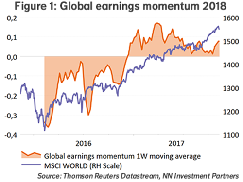 Equity markets are going through a soft patch this week. The weakness in European equities and cyclical sectors is especially noteworthy. Did something fundamentally change? We do not think so. The macro economic data are invariably strong, as was illustrated this week by the strong GDP data for Q3 in Germany. Business and consumer confidence also remain at high levels. At the same time, there is no sign of inflation, which gives central banks room to pursue a very gradual and predictable exit strategy. The earnings side remains strong, reflected in good Q3 earnings, especially in the US and Japan. The 2018 global earnings momentum has also improved further.