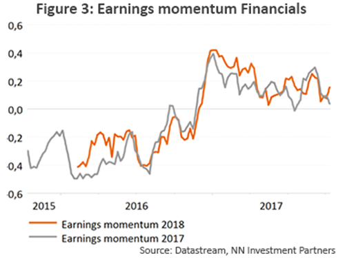 The earnings momentum for the sector may have weakened going into the season, but it remains positive and the 2018 momentum has even risen. Part of this weakening is linked to the insurance industry, which faces the impact of hurricane and earthquake-related damages. We maintain a medium overweight for the sector.