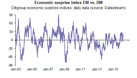 Trotzdem ist die Kehrtwende bei den Kapitalzuflüssen in die Schwellenländer laut NNIP einer der Faktoren, der die positive Stimmung gegenüber Vermögenswerten aus den Schwellenländern aufrechterhält. Außerdem sind die wirtschaftlichen Leitindikatoren für die Schwellenländer im Vergleich zu den Industriestaaten besser und ihre Währungen könnten sich erholen. Sowohl der Einkaufsmanagerindex als auch die Daten aus der Industrieproduktion legen nahe, dass sich das Wirtschaftswachstum in den Schwellenländern im Vergleich zu den Industriestaaten erholt. Die besseren Exportdaten im März und die schnellere Erholung des EM-Überraschungsindex gegenüber dem G-10-Überraschungsindex bestätigen dieses freundlichere Wachstumsbild (siehe nachstehende Abbildung).