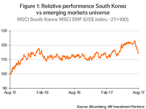 With South Korea alone accounting for 15% of the EM equity universe and Asia for no less than 72%, the sensitivity of EM to the evolving North Korea situation cannot be low. So if investors think that more Korea risk should be priced, the Asian markets will feel that relative to the rest of EM, and EM as a whole will have little chance to outperform DM. This we have seen in the past week: South Korea strongly underperformed (see Figure 1) and EM gave away all its outperformance over DM of the preceding weeks.