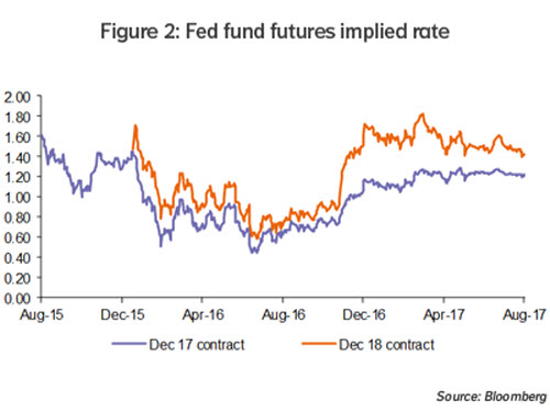Expectations of DM monetary policy normalisation have remained calm in the past weeks. This has been reflected by the Fed funds futures, which continue to move in a tight range (see Figure 2). For EM assets, this remains a good environment. As a result, flows to EM continue to be strong. This is the main reason why EM bond yields remain on a steady downward trend. The easing of EM financial conditions, which has been with us since the beginning of the year, explains why EM credit growth has started to pick up and why EM domestic demand growth has been strengthening and broadening out in the past months.