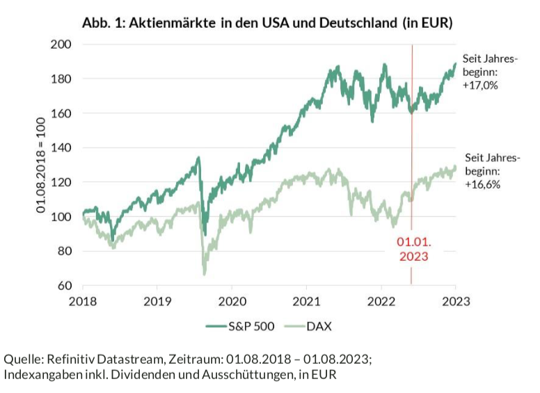 Der ausgeprägte Optimismus an den Aktienmärkten passt derzeit nur schwer zur tatsächlichen konjunkturellen Entwicklung. Die Abbildung 1 zeigt, dass der S&P-500-Index in den USA und der deutsche Leitindex Dax (jeweils in Euro) seit Jahresbeginn 2023 um rund 17% zugelegt haben.