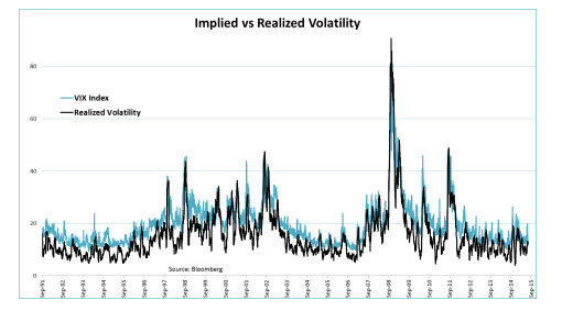 However, putting this theory into practice has undesirable side effects. Since investors, who hold equities, acknowledge that they are short risk, they are willing to pay a premium to hedge that short position in volatility. It’s exactly for this reason that the realized volatility is on average lower than the implied volatility (represented here by the VIX index.) The graph below shows this ‘volatility risk premium’ over time.