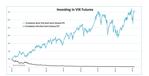 Since 2012, an investment in the ETF that goes long volatility would have been completely wiped out, while an investment in the short volatility ETF would have yielded a return of 600%. The difference: paying or receiving the volatility risk premium. I sincerely hope you have a crystal ball!