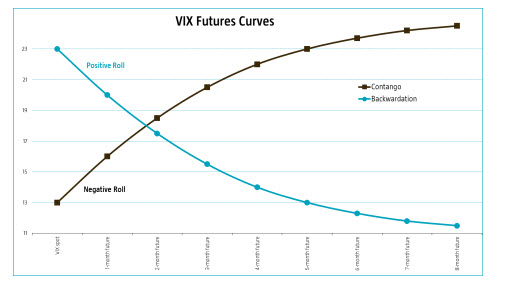 Since you can’t trade the VIX index directly, you have to turn to the derivatives market, instead. And there you will be confronted with the volatility risk premium in an unpleasant way. Let’s take the VIX futures market as an example. The graph below shows the two possible slopes of a futures curve, backwardation and contango. I will focus on contango here, since this is the dominant shape of the VIX futures curve, especially when volatility is low. (Mind you, the slope itself is irrelevant for the concept of the volatility risk premium.)