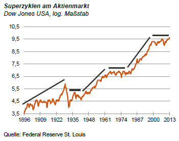Das ist jedoch zu kurz gedacht. In einer längeren Perspektive sieht das ganz anders aus. Um das zu erkennen, muss man auf Daten aus den USA zurückgreifen, weil Deutschland keine so langen Statistiken hat. In den Vereinigten Staaten gab es in den letzten hundert Jahren drei langfristige Aufschwungphasen am Aktienmarkt (siehe Grafik). Die eine dauerte von 1900 bis zur Weltwirtschaftskrise 1929. Das war die Phase der Industrialisierung in Amerika.