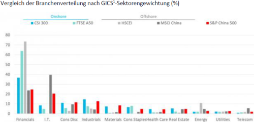 Der S&P China 500 Index verfügt gegenüber dem FTSE A50 (64 %), dem CSI300 (37 %) und dem HSCEI (73 %) mit Stand vom 31. August 2017 über ein Untergewicht im Finanzsektor (25 %). Höhere Gewichtungen verteilen sich auf die Sektoren der New Economy, wie IT (21 %) und Nicht-Basiskonsumgüter (12 %).