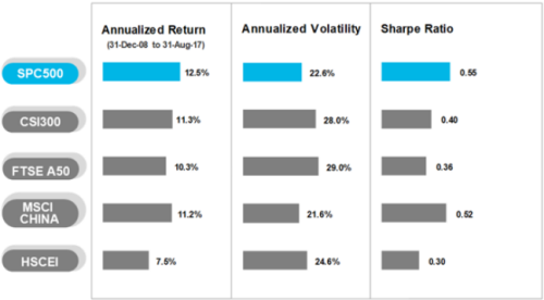 Dank seines diversifizierten Engagements in Märkten und Sektoren, wies der S&P China 500 bessere risikoadjustierte Renditen auf (Abbildung 2). Im Zeitraum vom 31. Dezember 2008 bis 31. August 2017 generierte der S&P China 500 eine annualisierte Rendite von 12,5 % und eine Sharpe-Ratio von 0,55 – beide Zahlen sind die höchsten unter den wichtigen chinesischen Indizes.