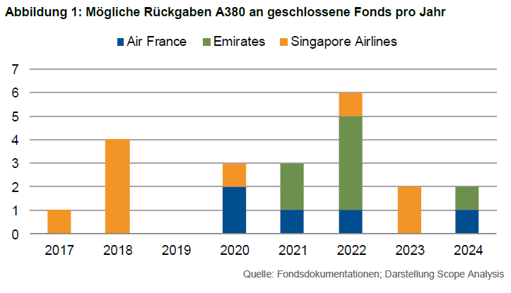 Verschärfend für die ohnehin nicht komfortable Lage für Manager und Anleger kommt hinzu: In den kommenden sechs Jahren laufen die Leasingverträge für weitere 16 Airbus A380 aus, die sich im Eigentum deutscher geschlossener Fonds befinden. Sollte für diese Modelle keine Anschlussvermietung möglich sein, müssten auch sie zerlegt und als Ersatzteile verkauft werden. In einem solchen Fall würde das massive Zusatzangebot auch die Preise für Ersatzteile nicht unberührt lassen. „Dies könnte weiteren negativen Einfluss auf die Performance der Fonds haben“, so Scope-Analyst Netscher.
