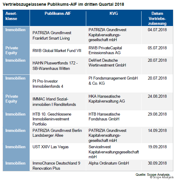 Die Ratingagentur Scope hat die im 3. Quartal emittierten geschlossenen Publikums-AIF erfasst. Neun AIF und 15 Vermögensanlagen wurden zum Vertrieb zugelassen. Das Emissionsvolumen sank, die Eigenkapitalquote stieg.