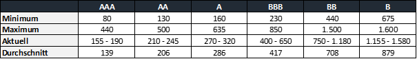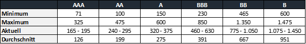 Jährliche Risikoprämie (über Referenz Zinssatz) von Europäischen CLOs 2.0 (in bp)