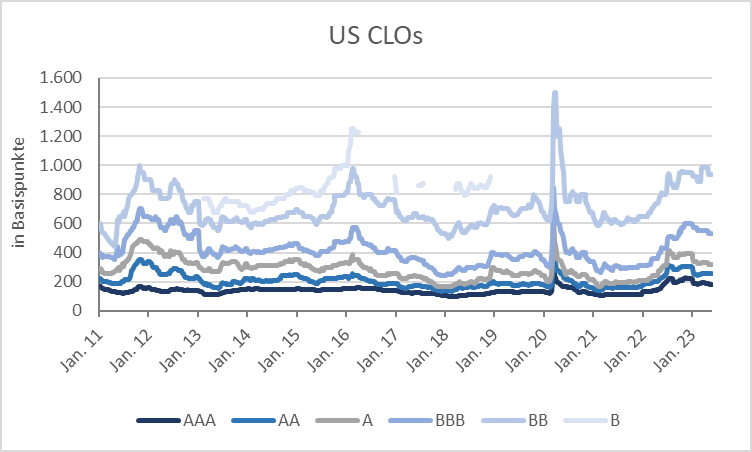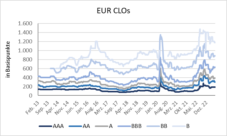 Die Risikoprämien von CLO-Tranchen haben sich in 2022 auf einen neuen Höhepunkt nach der Coronapandemie ausgeweitet, verengen sich jedoch leicht seit Anfang 2023.
