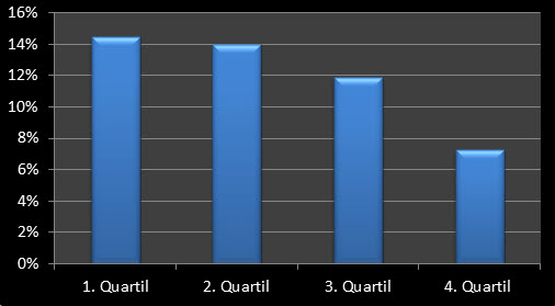 Der Unpopularitätsfaktor geht einen Schritt weiter. In einer Arbeit von Ibbotson et. al (2013) wird das Handelsvolumen der vergangenen 12 Monate genommen, um die aktuelle Performance zu erklären. Es zeigt sich, dass Titel, die am häufigsten gehandelt wurden (4. Quartil), danach im Schnitt am schlechtesten abschneiden. Andersherum schneiden die am wenigsten gehandelten Titel (1. Quartil) danach am besten ab.