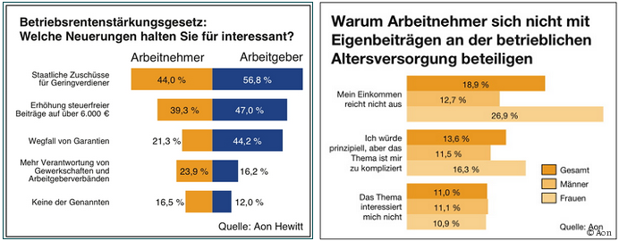 Zu geringes Einkommen und zu viel Bürokratie: Diese beiden Faktoren halten Arbeitnehmer offensichtlich davon ab, eigene Beiträge in Betriebsrenten zu investieren. Das ist eines der Ergebnisse einer repräsentativen Umfrage des Beratungs- und Dienstleistungsunternehmens Aon. Befragt wurden rund tausend Arbeitnehmer aus Großunternehmen mit mehr als 10.000 Beschäftigten.