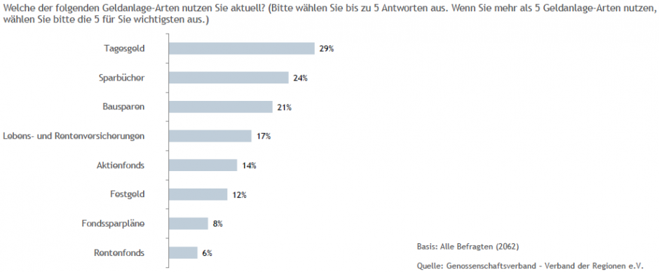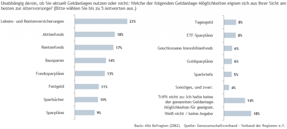 Nach wie vor sind die klassischen Bankprodukte Tagesgeld und Sparbücher die wichtigsten Geldanlagearten. Dahinter folgt Bausparen. Selbst Festgeld liegt weit vor Fondssparplänen, die ebenso wie Aktienfonds beim konkreten Anlageverhalten der Deutschen kaum eine Rolle spielen. Erstaunlich dabei: Danach befragt, welche Anlageformen denn sinnvoll für die Altersvorsorge seien, belegen niedrig verzinste Sparformen wie Festgeld, Sparbücher und Tagesgeld immerhin nicht die vorderen Ränge. Dass sie im Zusammenhang mit Altersvorsorge von den Befragten überhaupt genannt werden, ist aber schon erschreckend genug.
