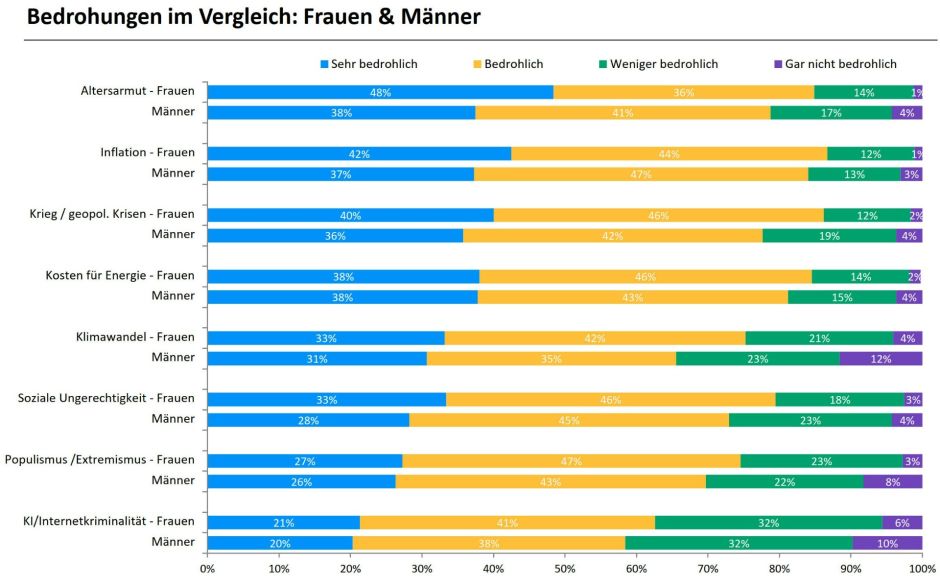 So liegt bei den Männern die Sorge vor Energiekosten tatsächlich gleichauf mit der Sorge vor Altersarmut. Bei Frauen folgt bei den sehr bedrohlichen Szenarien Inflation mit 42 Prozent, vor geopolitischen Krisen/Krieg mit 40 Prozent sowie den Kosten für Energie (38 Prozent). Mit jeweils 33 Prozent folgen die Sorgen vor Klimawandel sowie vor sozialer Ungerechtigkeit. „Die Sorge vor Altersarmut dürfte sich in nicht unerheblichem Maße aus den Sorgen vor Inflation sowie hohen Energiekosten speisen. Die Kostensituation steht bei vielen Frauen folglich im Fokus“, sagt Beatrix Vogel.