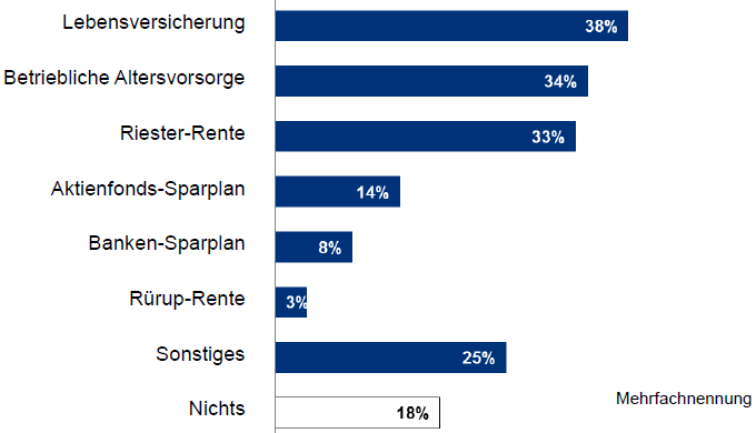 Die Lebensversicherung ist die meist genutzte Altersvorsorge. Zu diesem Ergebnis kommt die neuste Deutschland-Trend-Studie des Deutschen Instituts für Altersvorsorge (DIA). Von den befragten 1.040 Erwerbstätigen zwischen 18 und 65 Jahren, gaben 38 Prozent an, eine Lebensversicherung zu besitzen. Über eine betriebliche Altersvorsorge verfügen 34 Prozent, die Riester-Rente nutzen 33 Prozent. Aktienfonds-Sparpläne sind mit 14 Prozent abgeschlagen. Noch unbeliebter sind der Umfrage zufolge Banken-Sparpläne. Nur acht Prozent der Befragten gaben an, mit diesem Produkt für das Alter vorzusorgen. Die Rürup-Rente wird lediglich von drei Prozent der Befragten genutzt. Bemerkenswert: Immerhin 18 Prozent gaben an, gar keine Altersvorsorge zu haben.