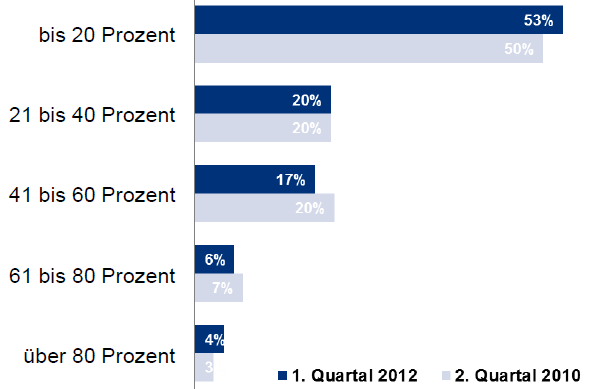 Neben der Riesterrente haben 19 Prozent der Befragten mit einer privaten Altersvorsorge noch ein weiteres Vorsorgeprodukt in ihrem Portfolio, in welches deutlich mehr eingezahlt wird: 53 Prozent gaben an bis zu 20 Prozent des investierten Betrags in die Riester-Rente zu legen. Nur vier Prozent zahlen über 80 Prozent ein. (siehe Grafik) Für die Zukunft planen 12 Prozent der Befragten, mehr in das Riesterprodukt einzuzahlen, 19 Prozent wollen eine andere Altersvorsorge bevorzugen. Für 69 Prozent besteht kein Grund für eine Veränderung.