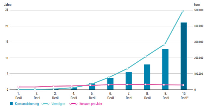 Haushalte, die zu den zehn Prozent der vermögens- bzw. einkommensstärksten zählen, könnten im Durchschnitt gut zehn Jahre lang ihr Lebensniveau halten. Dabei ist zu beachten, dass die Konsumausgaben mit der Höhe des Einkommens wachsen.