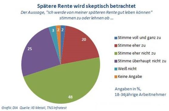 Viele junge Arbeitnehmer in Deutschland haben Angst vor späterer Altersarmut. Dabei würden sie ihre gesetzliche Rente durchaus mit Beiträgen aus der eigenen Tasche oder durch den Arbeitgeber aufstocken lassen. Rund 80 Prozent befürworten zudem, die staatliche Rentenfinanzierung durch die Einbeziehung der Selbstständigen und Beamten auf eine breitere Basis zu stellen. Diese Ergebnisse brachte eine Umfrage des Meinungsforschungsinstituts TNS zutage, die im Auftrag der IG Metall durchgeführt wurde.