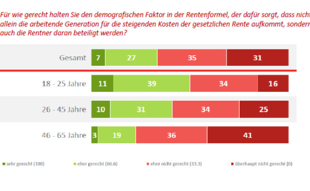 Laut Umfrage halten 77 Prozent der 46- bis 65-Jährigen den Nachhaltigkeitsfaktor für nicht oder eher nicht gerecht. Die 18- bis 25-Jährigen hingegen schätzen diese Form der Lastenverteilung doppelt so häufig als gerecht ein. Aber auch in der Altersgruppe der 26- bis 45-Jährigen herrscht deutlich mehr Zustimmung für den Nachhaltigkeitsfaktor. Diese Jahrgänge haben schließlich auch noch eine Menge Zeit und Einzahlungen in die Rentenversicherung vor sich.
