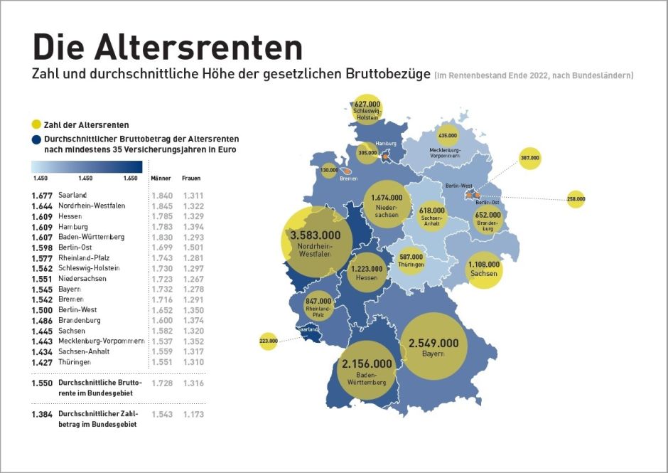 Zwischen den Bundesländern gibt es extreme Unterschiede in der Höhe der Bruttorenten. Nach einer Analyse der Deutschen Rentenversicherung für den Rentenatlas 2023 erhielten Männer in Nordrhein-Westfalen nach 35 Versicherungsjahren im Durchschnitt eine gesetzliche Monatsrente von 1840 Euro. In Thüringen betrug die durchschnittliche Monatsrente nach 35 Versicherungsjahren dagegen nur 1457 Euro.