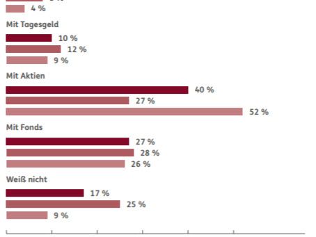 Hoch im Kurs ist immer noch das Sparbuch. Im Schnitt etwas mehr als jeder Dritte legt sein Geld auf diese renditearme Weise an. Ähnlich hoch (36 %) ist die Quote derjenigen, die auf einen Bausparvertrag setzen. Über eine private Renten- oder Lebensversicherung verfügen vier von zehn Befragten. Hochrentable Anlagen wie Aktien, Anleihen oder Fonds halten nur 25 % obwohl gut 40 % angaben, dass sich damit das meiste Geld erwirtschaften ließe.