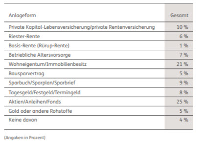 Die Sparbeträge fließen vor allem in Fonds (25 %). Immobilien bzw. Wohneigentum steht auf Platz Zwei mit 21 %. Staatlich geförderte Modelle wie die Riester-Rente (6 %) oder die Rürup-Rente (1 %) werden kaum nachgefragt.