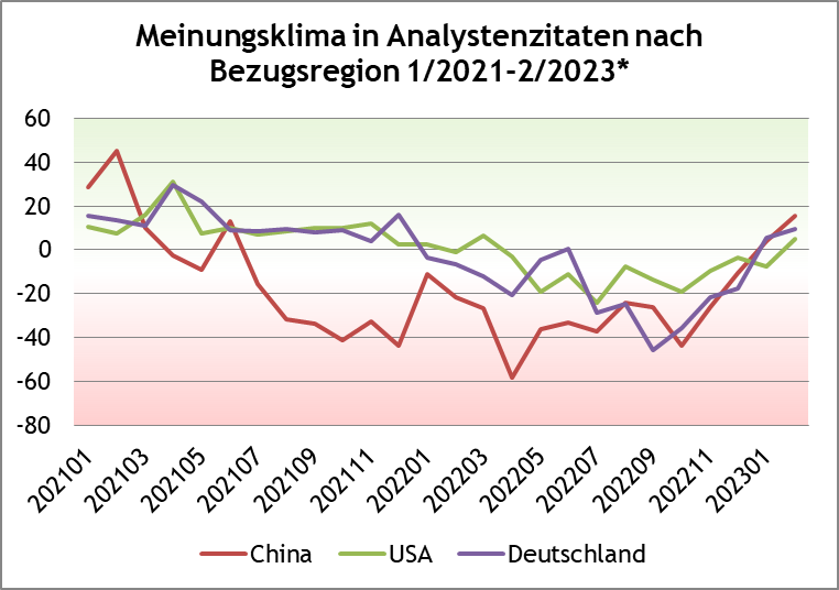 Das Meinungsklima der Analysten für China, Deutschland sowie den USA wird in internationalen Leitmedien wie dem Wall Street Journal und der Financial Times positiver.