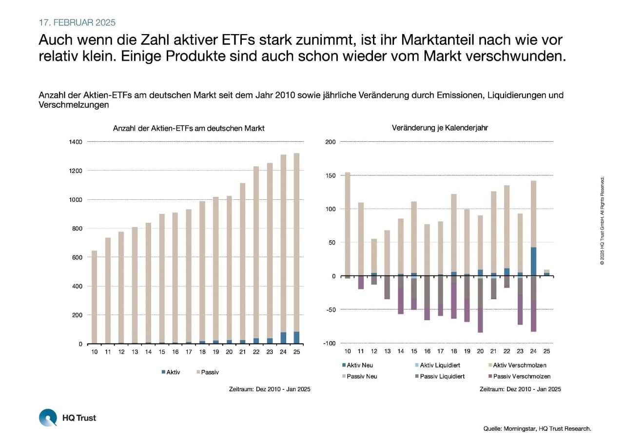 · „Zudem ist der Anteil der aktiven ETFs, die bereits wieder vom Markt verschwunden sind, überraschend hoch: Mehr als 15 Prozent der Produkte wurden bereits wieder geschlossen oder mit anderen fusioniert.“