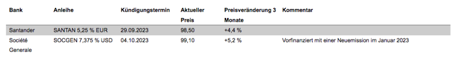 Seit dem Credit Suisse-Event im März 2023 haben nun insgesamt sieben Großbanken ihre CoCo-Anleihen gekündigt, jüngst am 04.08.23 die HSBC. Diese Kündigungen führen dazu, dass die entsprechenden Anleihen zu 100 zurückbezahlt werden, selbst wenn die Anleihen weit unter Par stehen. Die folgende Tabelle zeigt die Kündigungen in der Übersicht.