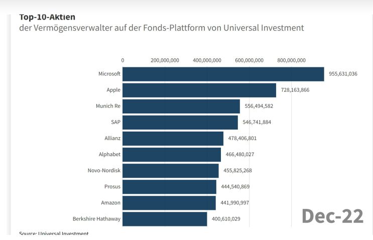 Die auf der Plattform von Universal Investment in die Analyse einbezogenen Publikumsfonds hatten zum 31. Dezember 2022 einen Wert von insgesamt 64,9 Milliarden Euro; davon sind etwa 8,2 Prozent in den Top-10-Unternehmen investiert. Im Vorjahr waren es 8,6 Prozent bei einem Volumen von 67,3 Mrd. Euro. (pg)