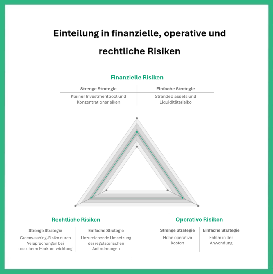 · Einfache ESG-Strategien: Ansätze, die ESG-Kriterien nur minimal oder oberflächlich berücksichtigen, bergen andere Gefahren. So kann es etwa zu stranded assets kommen, wenn Investitionen in Branchen oder Unternehmen fließen, die langfristig nicht mit Nachhaltigkeitszielen vereinbar sind. Solche Investitionen verlieren an Wert, wenn sich Märkte oder Regulierungen verschärfen. Auch die geringere Nachfrage nach nicht (mehr) ESG-konformen Anlagen auf dem Sekundärmarkt kann die Liquidität solcher Investments reduzieren. Schließlich erhöhen unzureichend definierte ESG-Kriterien das Risiko regulatorischer Strafen, da sie häufig nicht den steigenden Anforderungen von Aufsichtsbehörden entsprechen.