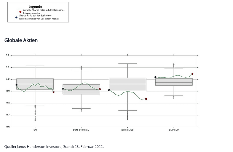 Die nachstehenden Grafiken zeigen die Sharpe Ratio auf der Basis eines Extremszenarios, definiert als das Verhältnis von erwarteten Extremgewinnen zu erwarteten Extremverlusten für verschiedene Vermögenswerte. Die grau schattierten Bereiche stellen den Interquartilsbereich dieses Verhältnisses über die letzten drei Jahre der täglichen Beobachtungen dar. Die Linie durch die graue Fläche stellt den Medianwert dar. Der blaue Punkt stellt die Sharpe Ratio auf der Basis eines Extremszenarios von vor einem Monat dar. Und schließlich stellt der rote Punkt die heutige Sharpe Ratio auf der Basis eines Extremszenarios dar. Je weiter oben der rote Punkt in der Grafik liegt, desto attraktiver ist der Vermögenswert.