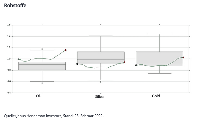Am Optionsmarkt beobachtet man nach wie vor eine größere Aufwärtsvolatilität für Öl und eine höhere Attraktivität für Gold. Gold - als realer Vermögenswert - könnte eventuell von einer moderateren geldpolitischen Straffung profitieren, da dies den Anstieg der Realzinsen begrenzen würde.