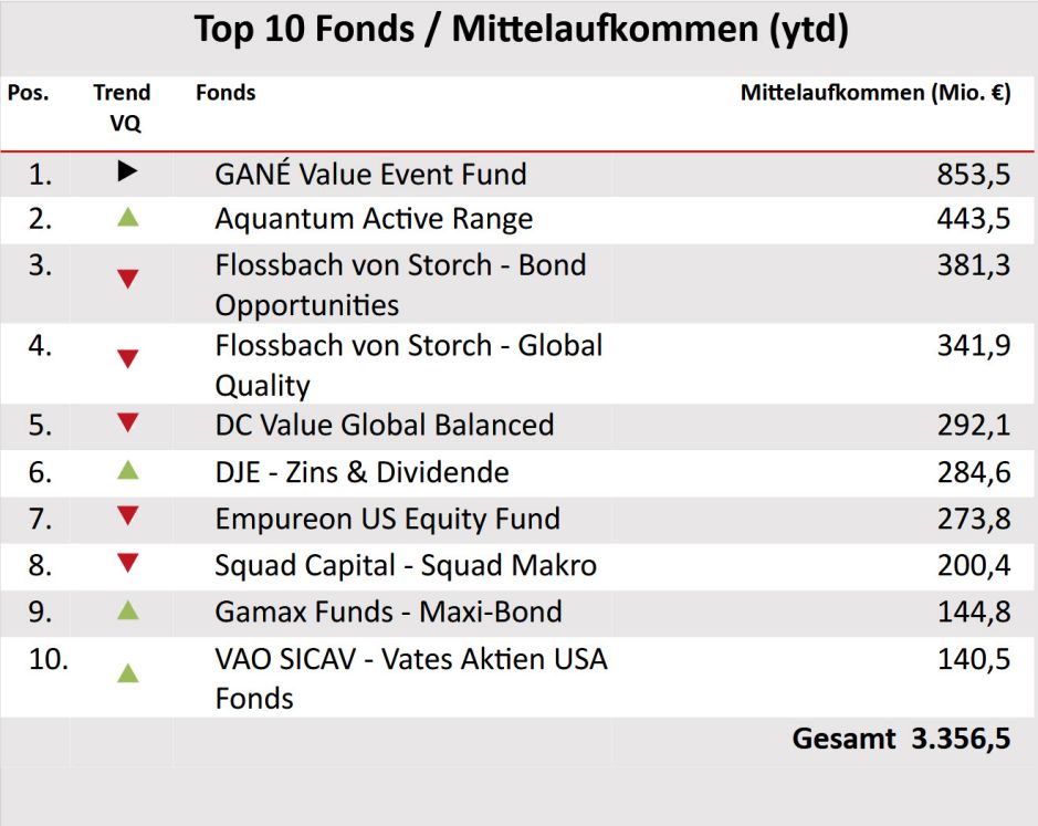 Die Top-10-Fonds nach Mittelaufkommen konnten sich auch im Jahr 2024 als zentrale Leistungsträger des Boutiquenmarktes behaupten. Im Vergleich zum Vorjahr steigerten sie ihr kumuliertes Mittelaufkommen deutlich von 2,7 Milliarden Euro auf 3,4 Milliarden Euro, was einer Zunahme von rund 26 Prozent entspricht. Diese positive Entwicklung unterstreicht das Vertrauen der Anleger in etablierte Konzepte, selbst in einem von Unsicherheiten geprägten Umfeld. Der „GANÉ Value Event Fund“ führt die Liste mit Zuflüssen von 850 Millionen Euro an. Der „Aquantum Active Range“ konnte sich mit 440 Millionen Euro auf einen starken zweiten Platz vorkämpfen, gefolgt vom „Flossbach von Storch - Bond Opportunities“, der mit 380 Millionen Euro weiterhin zu den bevorzugten Produkten gehört. Neu in der Rangliste sind Fonds wie der „Empureon US Equity Fund“ und der „VAO SICAV - Vates Aktien USA Fonds“, die mit innovativen Konzepten überzeugen konnten. Die starke Performance der Top-10-Fonds verdeutlicht die anhaltende Konzentration der Anlegergelder auf wenige, aber bewährte Produkte. Trotz der Mittelabflüsse im Gesamtmarkt setzen diese Fonds ein positives Signal und beweisen die Widerstandsfähigkeit des Boutiquensegments. (pg)