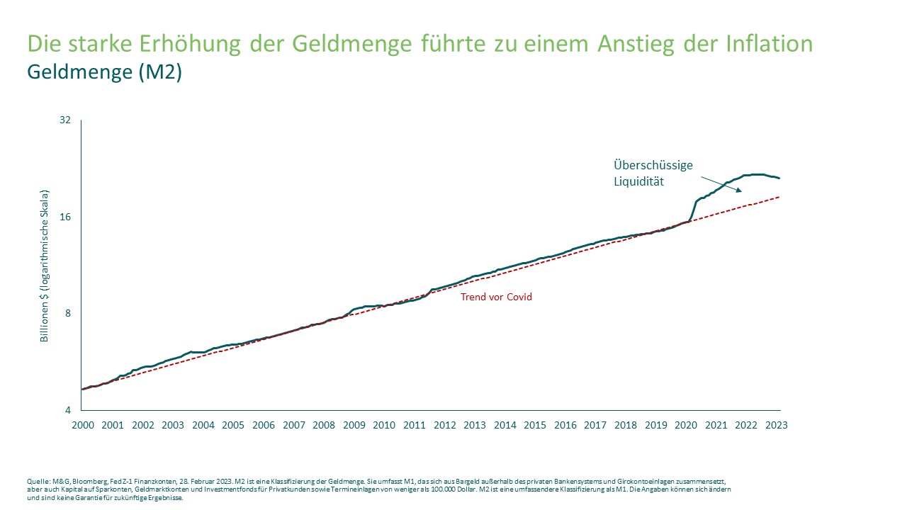 Viele Zentralbanken mussten die Zinssätze deutlich anheben, um den Preisanstieg zu bremsen. Dies hat die Volatilität an den Anleihemärkten verschärft. Doch die Inflation – vor allem ohne Berücksichtigung der Lebensmittel- und Ölpreise – ist trotzdem hartnäckig hoch geblieben. Unserer Meinung nach gibt es zwei Hauptgründe für diesen Inflationsdruck: die ultralockere Geldpolitik und die konjunkturellen Maßnahmen während der Coronakrise. Diese Maßnahmen waren zwar in vielen Fällen notwendig, sie haben jedoch weltweit zu einem erheblichen Liquiditätsüberschuss geführt.